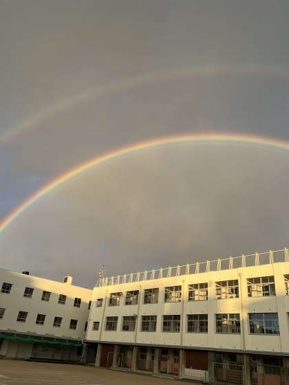 今日は急に雨が降ったり、強い風が吹いたりと、不安定な一日でしたが、夕方、くっきりと、しかも二重の虹が出ていました。