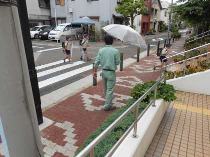 朝の作業が終わると登校指導も先生と一緒に行います。