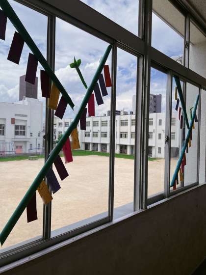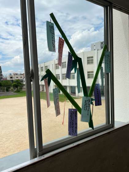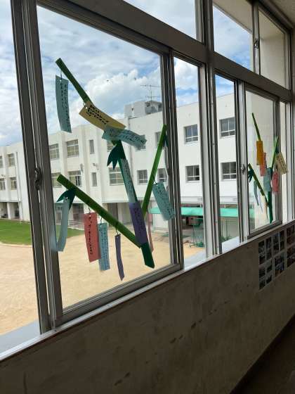 南館2階、各教室の前の廊下に、短冊のついた笹が並びました。