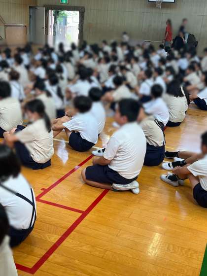 朝早くから気温が高かったため、今日は講堂で朝会を行いました。