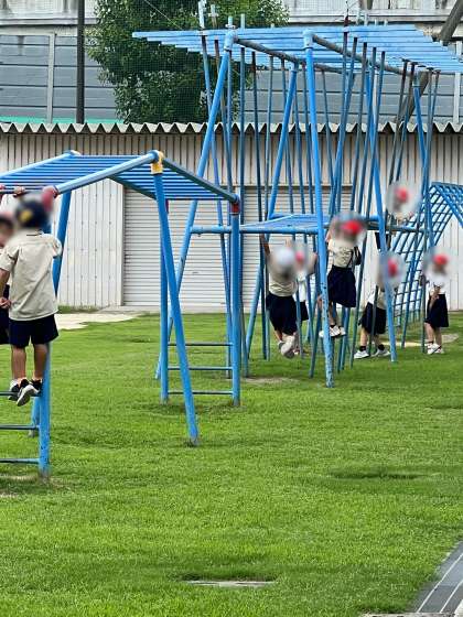 月曜日は暑さ指数が高く、運動場では遊ぶことができませんでしたが、今日は曇り空のため、遊ぶことができました。