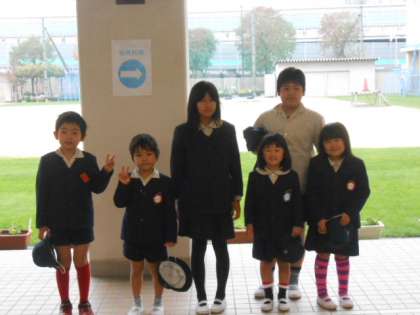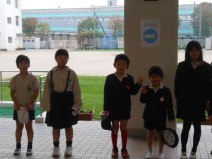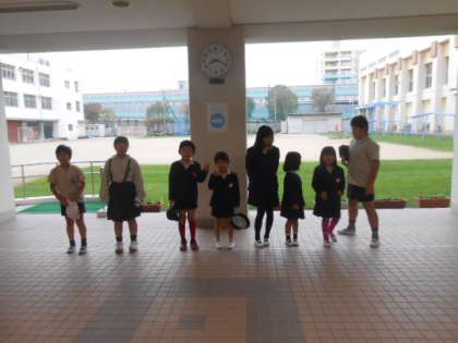 7Aの子どもたちが玄関前に立ちあいさつをしています。