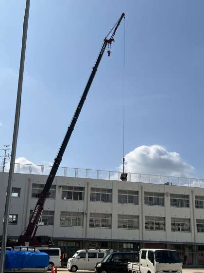 排気口が屋上にあるので、超大型のクレーンを使って作業をしていました。