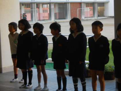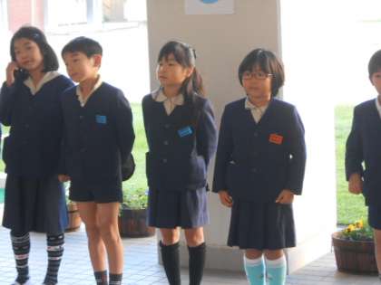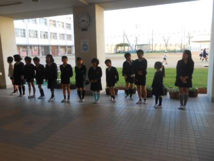 今日は6Bの子どもたちが玄関前であいさつしています。