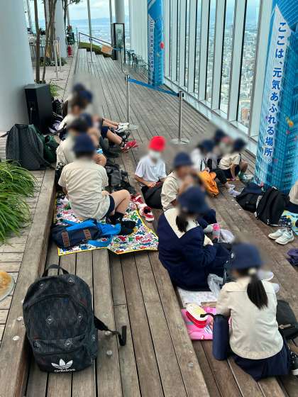 受付後、さらにエレベーターに乗り、まずは57階で記念写真撮影をし、お弁当を食べました。