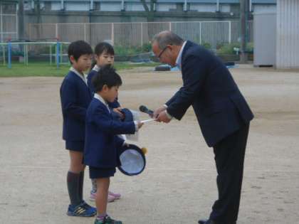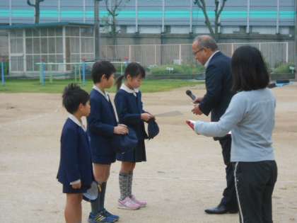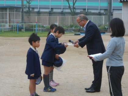 みんなの前で表彰されたので、緊張と照れが顔に出ています。