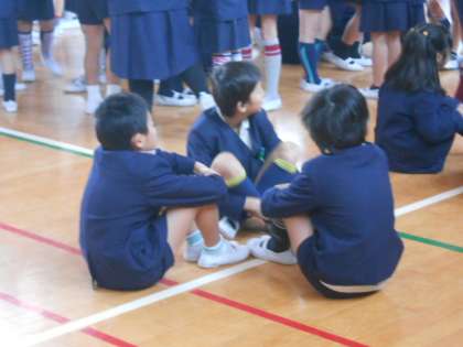 人数を合わせようと子どもたちは講堂の中をウロウロしています。