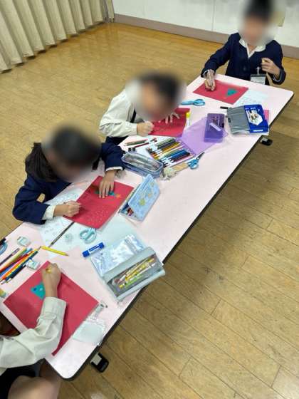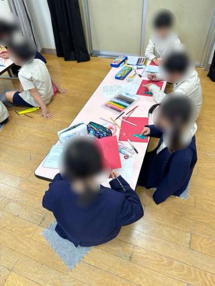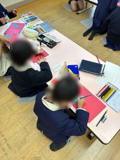 画用紙に色紙やシールを貼ったり、絵を描いたりして飾りつけていきます。