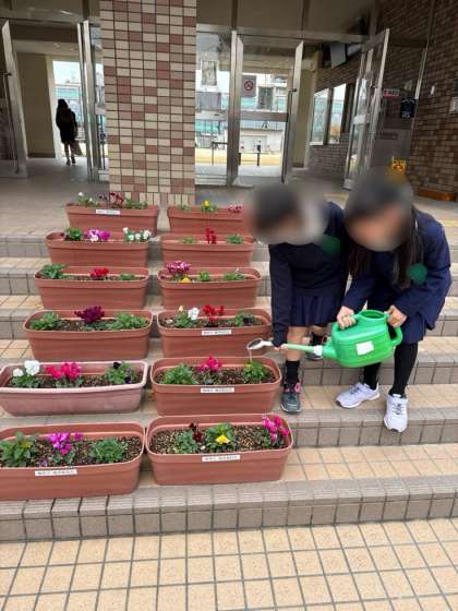 以前、2年生の子どもたちが地域の方と一緒に植えた花に、毎日水をやっています。