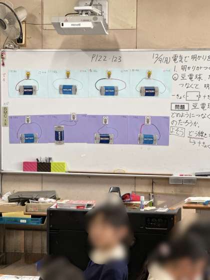 乾電池と豆電球で、電気の通り道について学習しました。