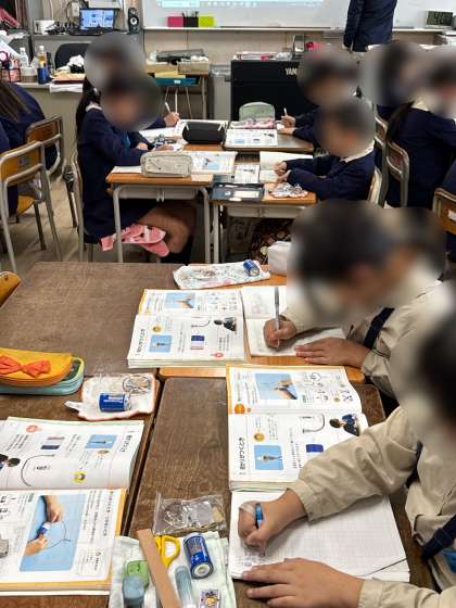 乾電池と豆電球をどのように繋げば明かりがつくか、いろいろ試していました。
