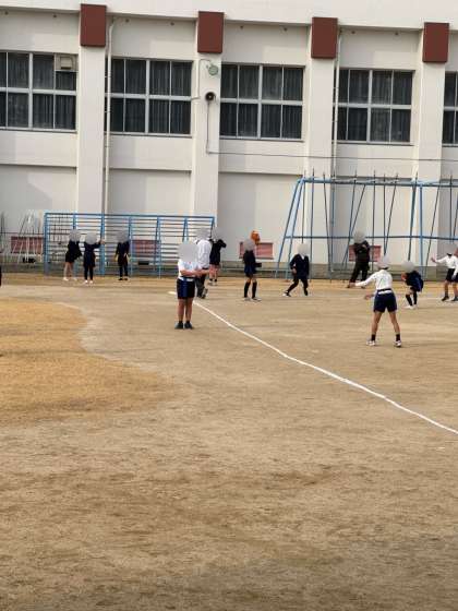 楕円形のボールはどのように投げればよく飛ぶか、試しながら繰り返し練習していました。
