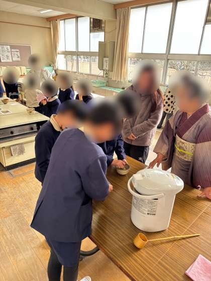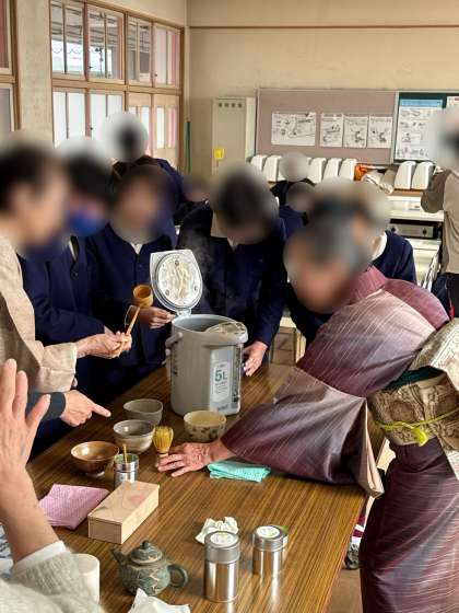 6年生の授業では、お茶を飲んだ後、代表の児童がお茶を点てる体験をしました。