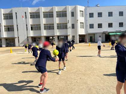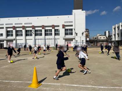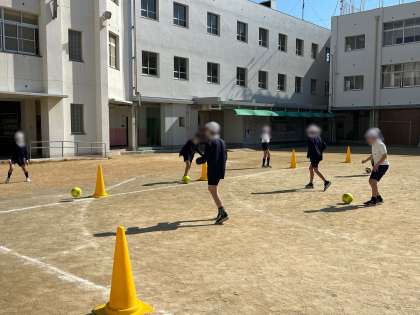 ペアでボールをドリブルしながら追いかけっこをしたり、カラーコーンの的にボールを当てるゲームをしたりと、6年生も楽しく活動しました。
