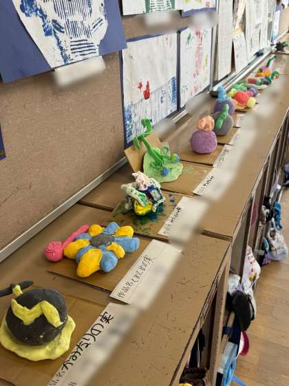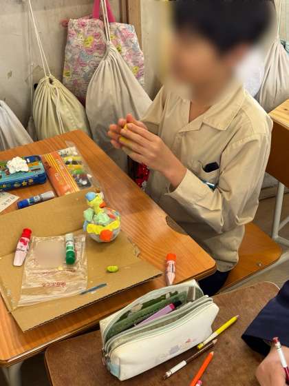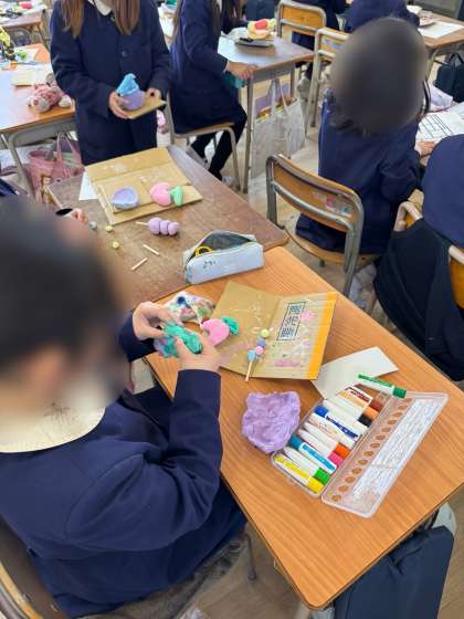絵の具を練り込んだ粘土で、アニメに登場するような不思議な木の実を作っていました。