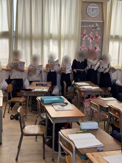 登場人物の「がまくん」「かえるくん」、そしてナレーター役に分かれ、それぞれ教室の三方に集まって音読をしていました。