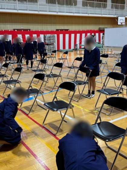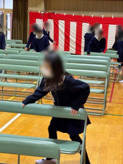 イスは一つ一つ、床のラインや床板に揃えて並べていき、練習で使っていた卒業生、在校生のイスもきちんと並べ直しました。