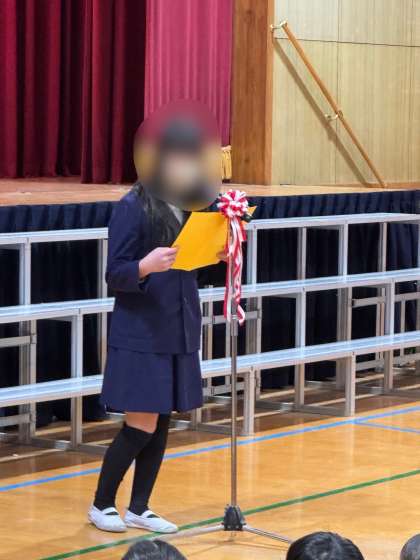 その後、離任が決まっている教職員からの挨拶があり、寂しい気持ちになった児童もいましたが、今年度最後の校歌を元気に歌っていました。
