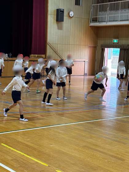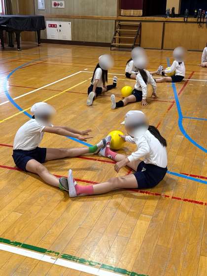 次は2人の足元にボールを置き、先生の「ボール」「頭」「ひざ」などの言葉を聞いて素早く体を動かします。