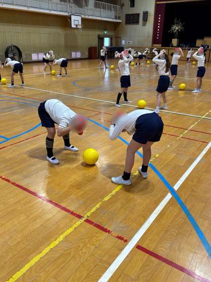 2人で足を伸ばして座り、自分の周りにボールを転がしていきます。