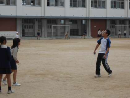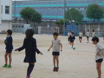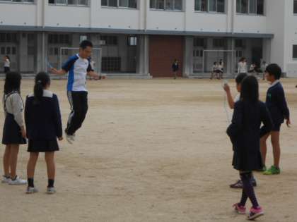 5時間目の休み時間6年生のお兄さんお姉さんもなわとびをしています。担任のA先生が模範演技を見せています。