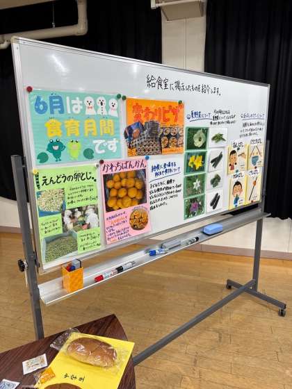 多目的室で給食を試食したり栄養職員から給食についての話を聞いたりした後、給食を準備したり食べたりしている児童の様子を見ていただきました。