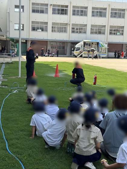 その間、1,2年は、学校で水消火器、煙中体験、起震車による地震体験、消防車の見学などを行いました。