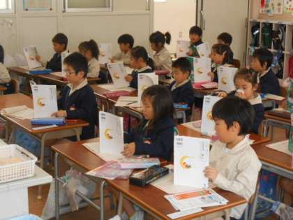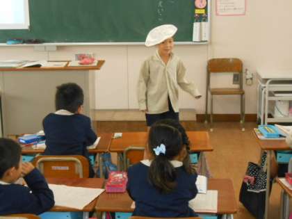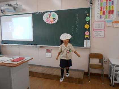 国語科の「サラダでげんき」を学習しています。ゾウがせかせかと歩く様子を動作で表しています。難しい言葉をイメージで理解しようとしています。