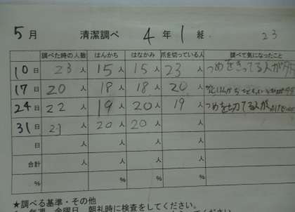 毎週金曜日、朝の会の時間に健康委員会の人たちが各学級に行って清潔検査をしています。