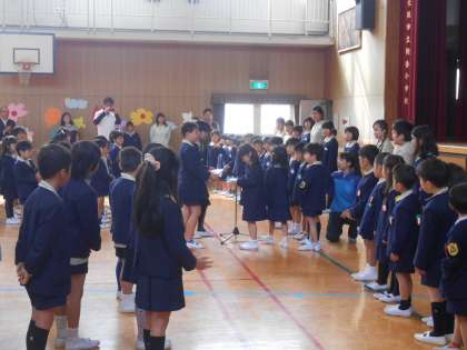 地域の方や梅香小学校のみんなから心のこもった「おまもり」を1年生に渡しました。