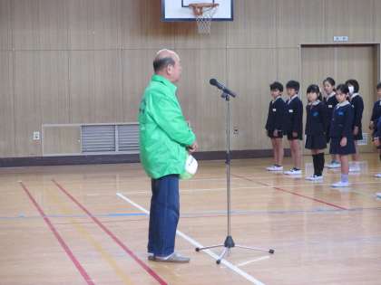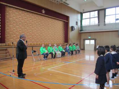 今日は、児童朝会で見守り隊の方々とのごあいさつ会をしました。