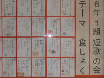 6年生の国語科の学習で「短歌」を作りました。テーマは「食」で苦心の跡がうかがえます。コンテストになっていて投票用紙で、気に入った作品に1票入れることができます。