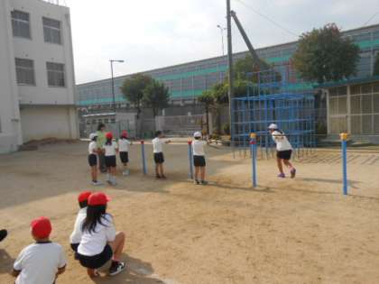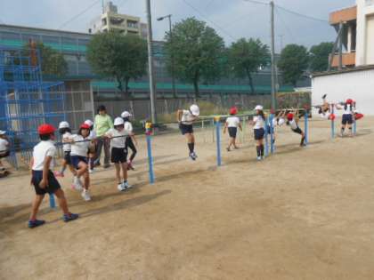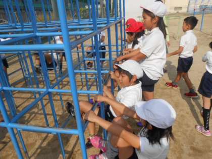 3年生が鉄棒の学習をしています。前回りおり、逆上がりの練習をしていました。子どもたちの様子を見ていると、鉄棒が苦手な子どもは、逆さになる感覚に怖さがあったり、鉄棒の硬さに怖さがあるようです。そこで、ジャングルジムやのぼり棒を使って練習してみました。