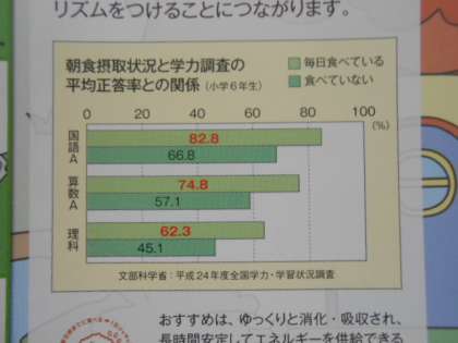 1年生に配布しましたリーフレット(文部科学省)に、衝撃の事実が載っていたので紹介します。毎朝、朝ごはんを食べている児童とそうではない児童の、平成24年度全国学力学習状況調査の平均正答率を比べてみるとつぎのような事実が判明しました。