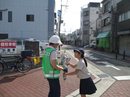 いつも登下校を見守ってくださっている、見守り隊のみなさんに、ユリをプレゼントしました。