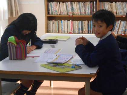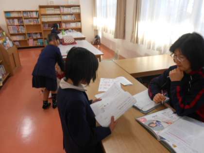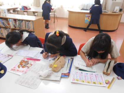 今日は、先生方は研修で春日出中学校へ出張です。3年生以上の子どもたちが図書館に残って宿題をしていました。