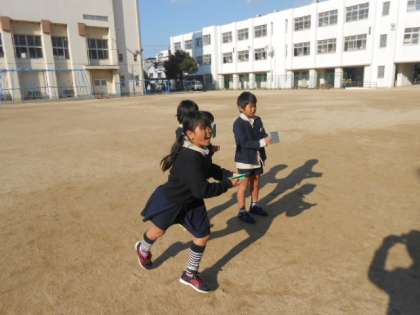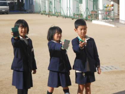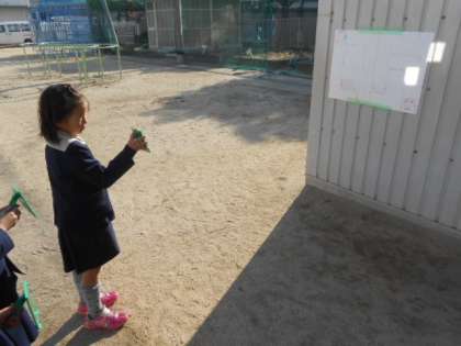 壁にそれぞれのグループが工夫して道路を書いたり的当てにしたりして、楽しんで学習できるようにしています。