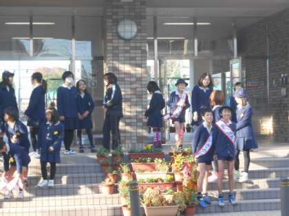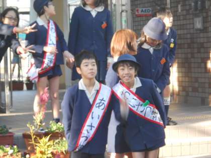 今日は、寒い朝です。新聞・放送委員会の子どもたちによるあいさつ運動です。
