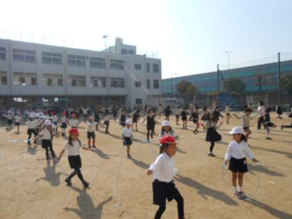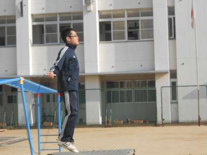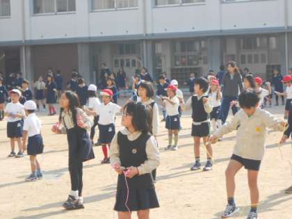 今年度から「なわとび週刊」をはじめました。曲にあわせて「リズムなわとび」をしたり、長い時間跳びつづけたりします。今日は体育主任のA先生の説明を受けました。