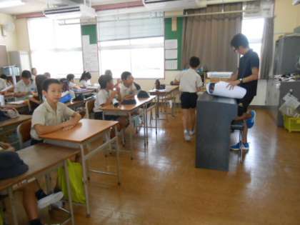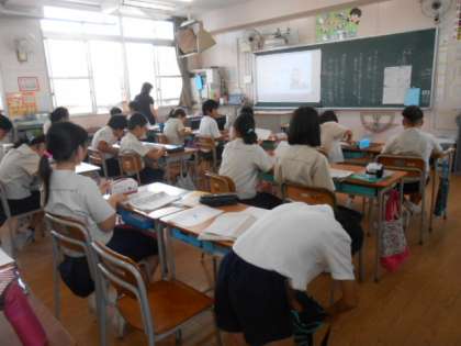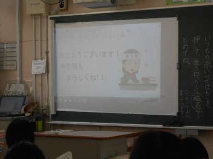 6年生の教室では、先生のやる気がプロジェクターに表れていました。