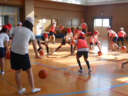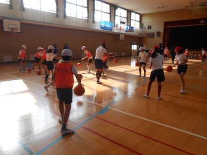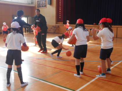 大阪エヴェッサの選手に、6年生のみんながバスケットボールを教えてもらいました。