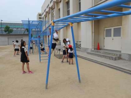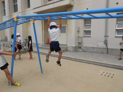 やすみじかん うんていをつかってあそんでいます。いっことばしやうしろむきなど、むずかしいわざにもちょうせんしています。