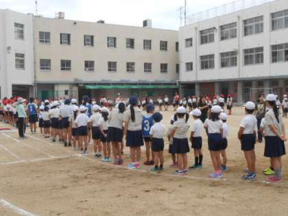 たてわり班で大玉送りの練習をしました。今日は、並び方の練習でした。
