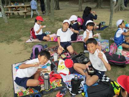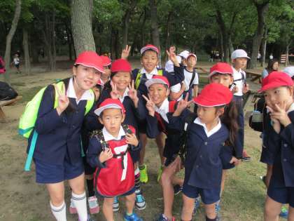 遠足のオリエンテーリングみんなで協力して頑張ってました!高学年の人は低学年のお世話を頑張りすぎてちょっと疲れている人もいましたね。でもしっかりとお姉さんお兄さん役をしている証拠です。全校遠足はまるで大名行列のように長い列になりますね(笑)。