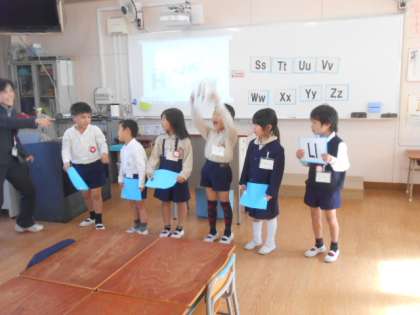 1年生は、毎朝、モジュール学習で行っている英語の学習を公開しました。梅香小学校では全普通教室に天井からプロジェクタを設置し、朝のBMC(梅香モーニングチャレンジ)の時間にgrapeseedという教材を使って英語のモジュール学習を全学年で行っています。プロジェクタを常時設置することにより、DVD教材や書画カメラが使いやすく、手軽に子どもたちに見せることが可能となっています。