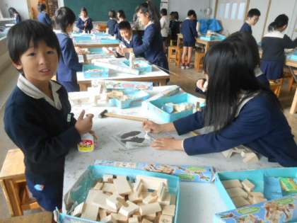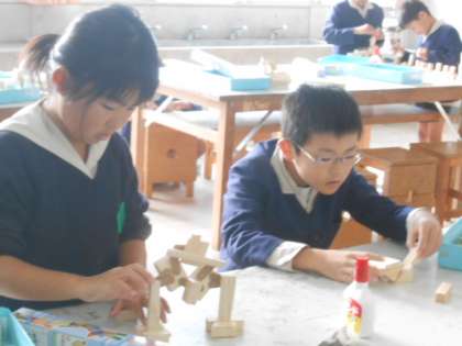 金づちでくぎをさしたり、木と木をボンドでくっつけたりして木を使った作品を作っています。みんな真剣に取り組んでいますね!すばらしい!