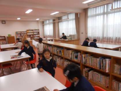 昨日とは違って朝から雨です。昼休み、子どもたちのなかには、図書室で本を読む子もいます。図書委員の仕事です。