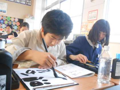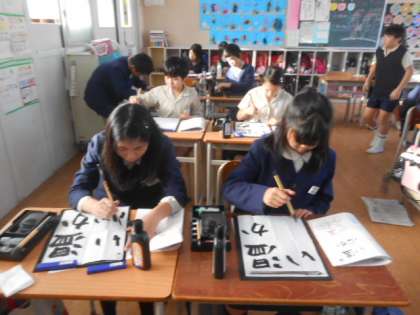 11月18日に6年生は習字をしました。集中して「温かい心」と書いてます。とめ!はね!はらい!を、とても気を付けて書いてますね。温かい心で書いてください。