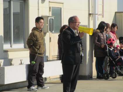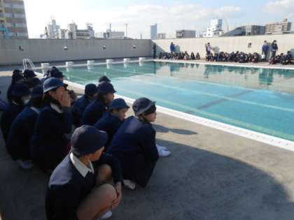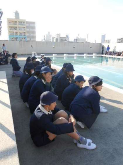 地震発生の避難訓練として、始めに運動場に避難しました。