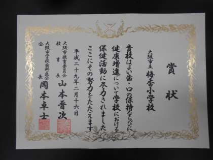 大阪府学校歯科医会より、よい歯の賞状をいただきました。